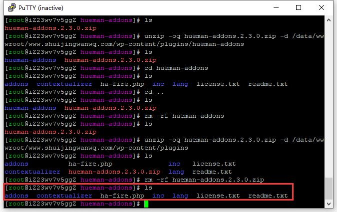4、在生产服务器 CentOS 7 中,下载 hueman-addons.2.3.0.zip 并解压至目录:/data/wwwroot/www.shuijingwanwq.com/wp-content/plugins/hueman-addons 。如图3