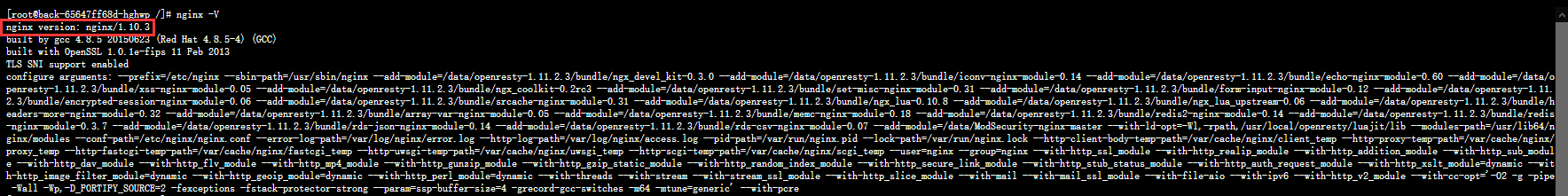 nginx version: nginx/1.10.3 built by gcc 4.8.5 20150623 (Red Hat 4.8.5-4) (GCC) built with OpenSSL 1.0.1e-fips 11 Feb 2013 TLS SNI support enabled configure arguments: --prefix=/etc/nginx --sbin-path=/usr/sbin/nginx --add-module=/data/openresty-1.11.2.3/bundle/ngx_devel_kit-0.3.0 --add-module=/data/openresty-1.11.2.3/bundle/iconv-nginx-module-0.14 --add-module=/data/openresty-1.11.2.3/bundle/echo-nginx-module-0.60 --add-module=/data/openresty-1.11.2.3/bundle/xss-nginx-module-0.05 --add-module=/data/openresty-1.11.2.3/bundle/ngx_coolkit-0.2rc3 --add-module=/data/openresty-1.11.2.3/bundle/set-misc-nginx-module-0.31 --add-module=/data/openresty-1.11.2.3/bundle/form-input-nginx-module-0.12 --add-module=/data/openresty-1.11.2.3/bundle/encrypted-session-nginx-module-0.06 --add-module=/data/openresty-1.11.2.3/bundle/srcache-nginx-module-0.31 --add-module=/data/openresty-1.11.2.3/bundle/ngx_lua-0.10.8 --add-module=/data/openresty-1.11.2.3/bundle/ngx_lua_upstream-0.06 --add-module=/data/openresty-1.11.2.3/bundle/headers-more-nginx-module-0.32 --add-module=/data/openresty-1.11.2.3/bundle/array-var-nginx-module-0.05 --add-module=/data/openresty-1.11.2.3/bundle/memc-nginx-module-0.18 --add-module=/data/openresty-1.11.2.3/bundle/redis2-nginx-module-0.14 --add-module=/data/openresty-1.11.2.3/bundle/redis-nginx-module-0.3.7 --add-module=/data/openresty-1.11.2.3/bundle/rds-json-nginx-module-0.14 --add-module=/data/openresty-1.11.2.3/bundle/rds-csv-nginx-module-0.07 --add-module=/data/ModSecurity-nginx-master --with-ld-opt=-Wl,-rpath,/usr/local/openresty/luajit/lib --modules-path=/usr/lib64/nginx/modules --conf-path=/etc/nginx/nginx.conf --error-log-path=/var/log/nginx/error.log --http-log-path=/var/log/nginx/access.log --pid-path=/var/run/nginx.pid --lock-path=/var/run/nginx.lock --http-client-body-temp-path=/var/cache/nginx/client_temp --http-proxy-temp-path=/var/cache/nginx/proxy_temp --http-fastcgi-temp-path=/var/cache/nginx/fastcgi_temp --http-uwsgi-temp-path=/var/cache/nginx/uwsgi_temp --http-scgi-temp-path=/var/cache/nginx/scgi_temp --user=nginx --group=nginx --with-http_ssl_module --with-http_realip_module --with-http_addition_module --with-http_sub_module --with-http_dav_module --with-http_flv_module --with-http_mp4_module --with-http_gunzip_module --with-http_gzip_static_module --with-http_random_index_module --with-http_secure_link_module --with-http_stub_status_module --with-http_auth_request_module --with-http_xslt_module=dynamic --with-http_image_filter_module=dynamic --with-http_geoip_module=dynamic --with-http_perl_module=dynamic --with-threads --with-stream --with-stream_ssl_module --with-http_slice_module --with-mail --with-mail_ssl_module --with-file-aio --with-ipv6 --with-http_v2_module --with-cc-opt='-O2 -g -pipe -Wall -Wp,-D_FORTIFY_SOURCE=2 -fexceptions -fstack-protector-strong --param=ssp-buffer-size=4 -grecord-gcc-switches -m64 -mtune=generic' --with-pcre
