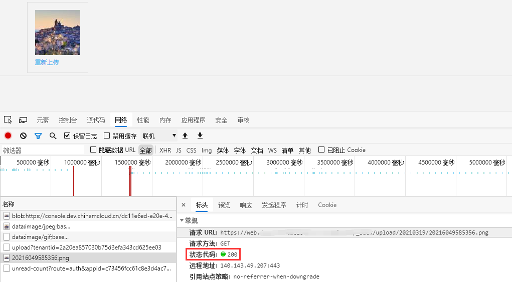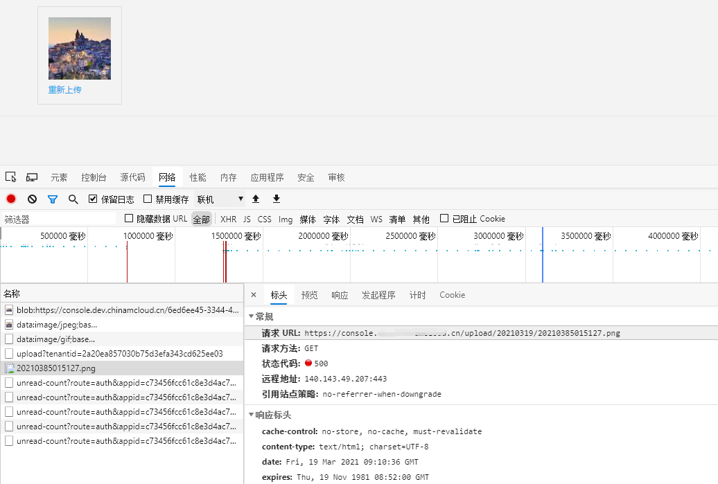 1、上传图片成功之后,GET 请求:https://console.xxx.cn/upload/20210319/20210385015127.png ,响应 500。根源在于上传成功后的图片的域名不是:https://console.xxx.cn ,而是:https://web.xxx.cn 。如图1