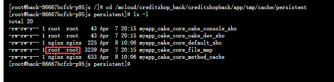 [root@back-86667bcfcb-p95js /]# cd /mcloud/creditshop_back/creditshopback/app/tmp/cache/persistent [root@back-86667bcfcb-p95js persistent]# ls -l total 20 -rw-rw-r-- 1 root root 43 Apr 7 20:15 myapp_cake_core_cake_console_zho -rw-rw-r-- 1 root root 43 Apr 7 20:15 myapp_cake_core_cake_dev_zho -rw-rw-r-- 1 nginx nginx 225 Apr 8 10:06 myapp_cake_core_default_zho -rw-rw-r-- 1 root root 3239 Apr 7 20:15 myapp_cake_core_file_map -rw-rw-r-- 1 nginx nginx 633 Apr 8 10:06 myapp_cake_core_method_cache [root@back-86667bcfcb-p95js persistent]#