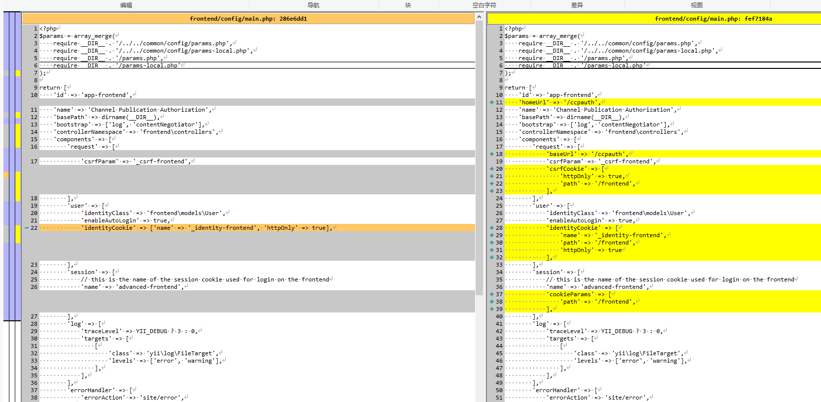 1、从多域名模式修改为单域名模式,修改了文件:frontend/config/main.php。如图1