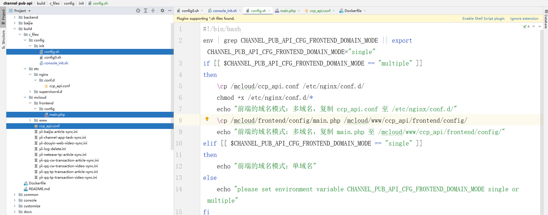 4、决定准备多域名下的两份文件,基于 shell 脚本,判断环境变量:CHANNEL_PUB_API_CFG_DOMAIN_NAME_MODE=multiple,执行文件拷贝。