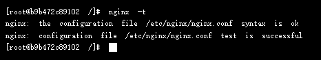[root@b9b472c89102 /]# nginx -t nginx: the configuration file /etc/nginx/nginx.conf syntax is ok nginx: configuration file /etc/nginx/nginx.conf test is successful [root@b9b472c89102 /]#
