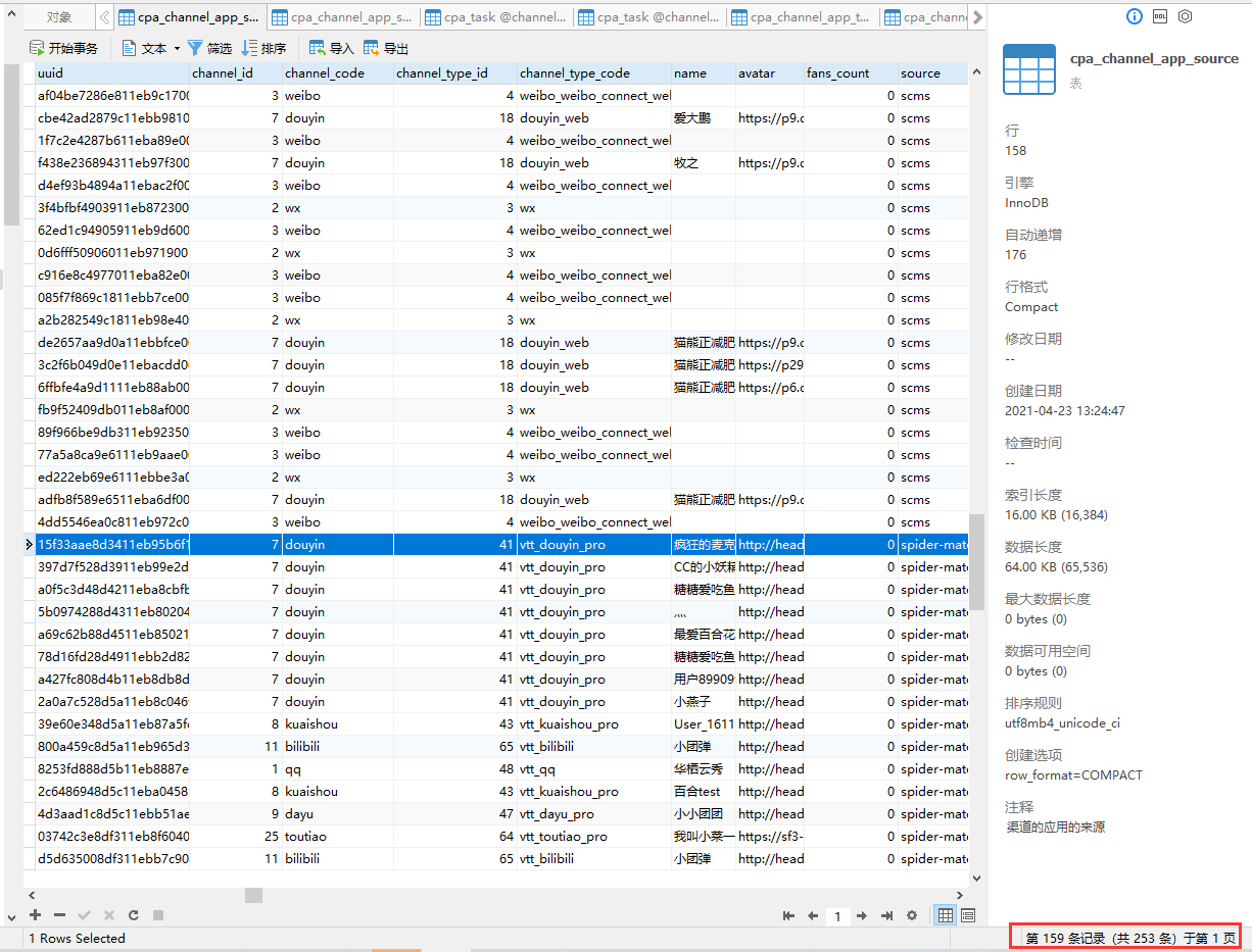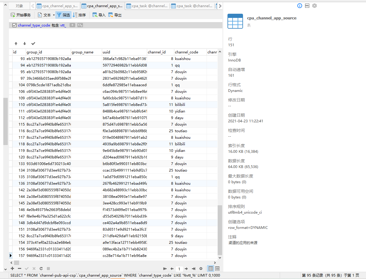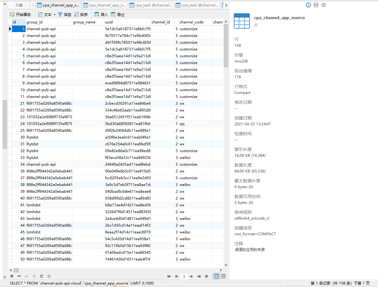2、`channel-pub-api-cloud`.`cpa_channel_app_source`。总计查询出 158 条记录。如图2