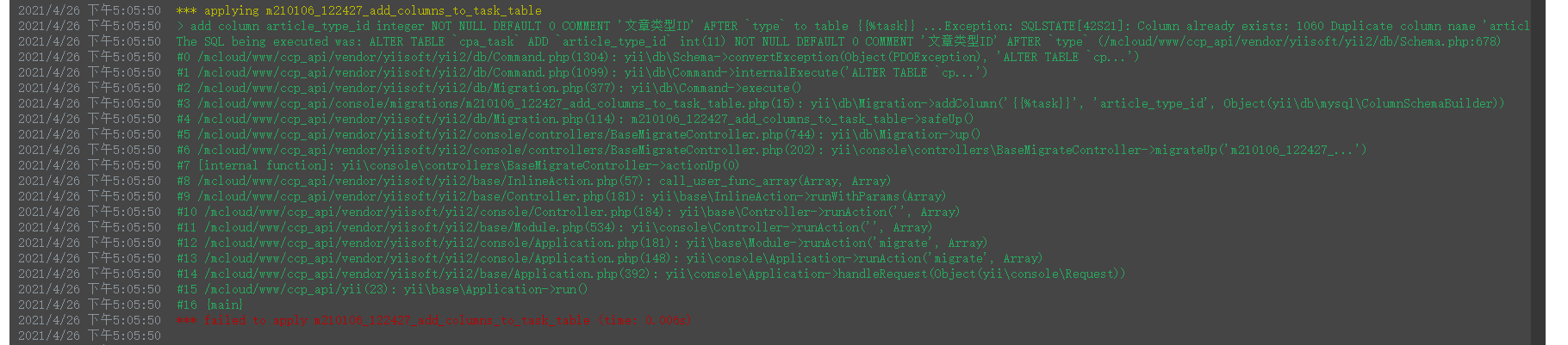 4、查看日志,仍然是数据库迁移重复执行的问题。查看 MySQL 中的表结构与迁移表中的记录,确定迁移记录:m210402_052030_add_columns_to_channel_app_source_table 在迁移表中不存在,但是 MySQL 中的表结构已经是此迁移记录执行后的结果。如图4