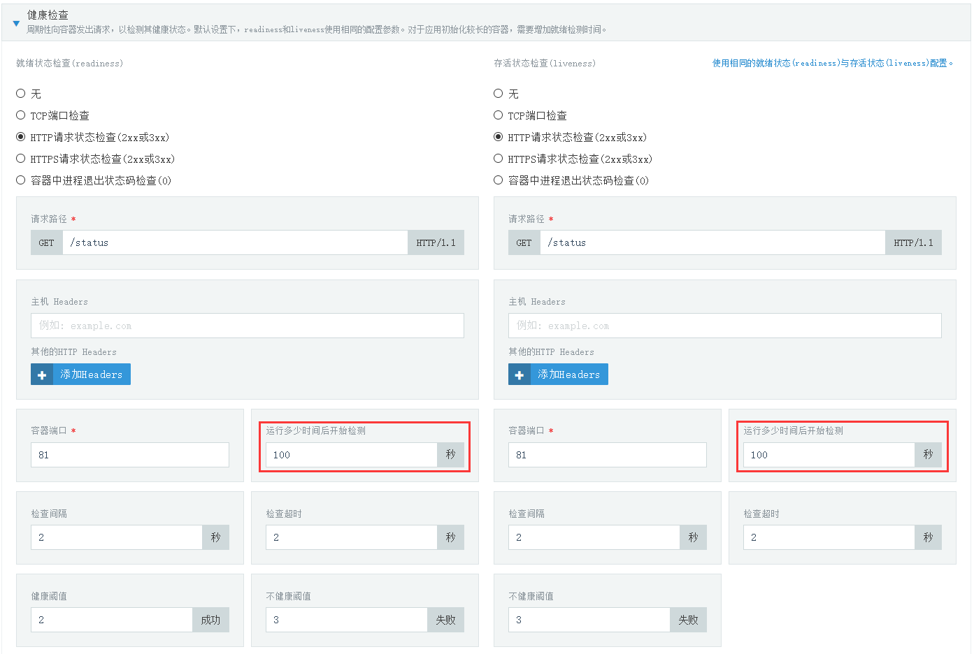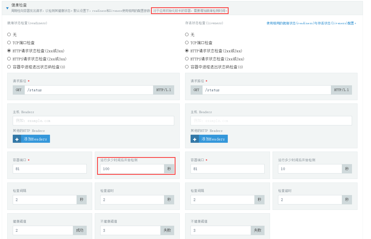 2、已经确定数据库结构并未被手动修改过。分析容器的健康检查。周期性向容器发出请求,以检测其健康状态。默认设置下,readiness和liveness使用相同的配置参数。对于应用初始化较长的容器,需要增加就绪检测时间。初步分析结论:由于数据库迁移执行时间过长,导致容器初始化时间过长,导致健康检查失败,再导致容器不断启动运行,数据库迁移重复执行。决定增加就绪检测时间。运行多少时间后开始检测:10秒 -> 100秒。如图2