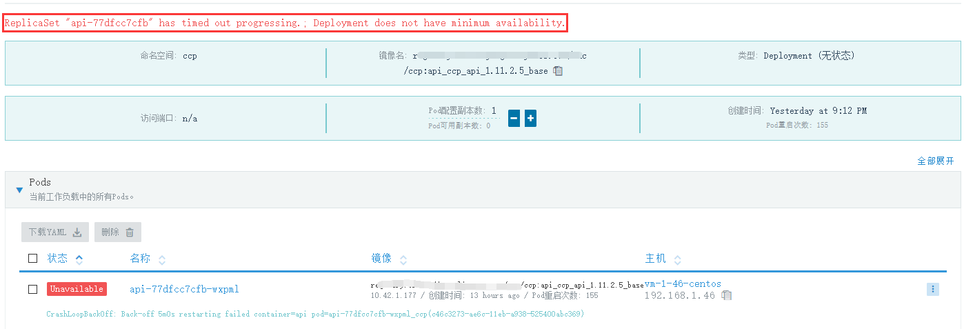 3、在初始部署时仍然报错:ReplicaSet “api-77dfcc7cfb” has timed out progressing.; Deployment does not have minimum availability.。如图3