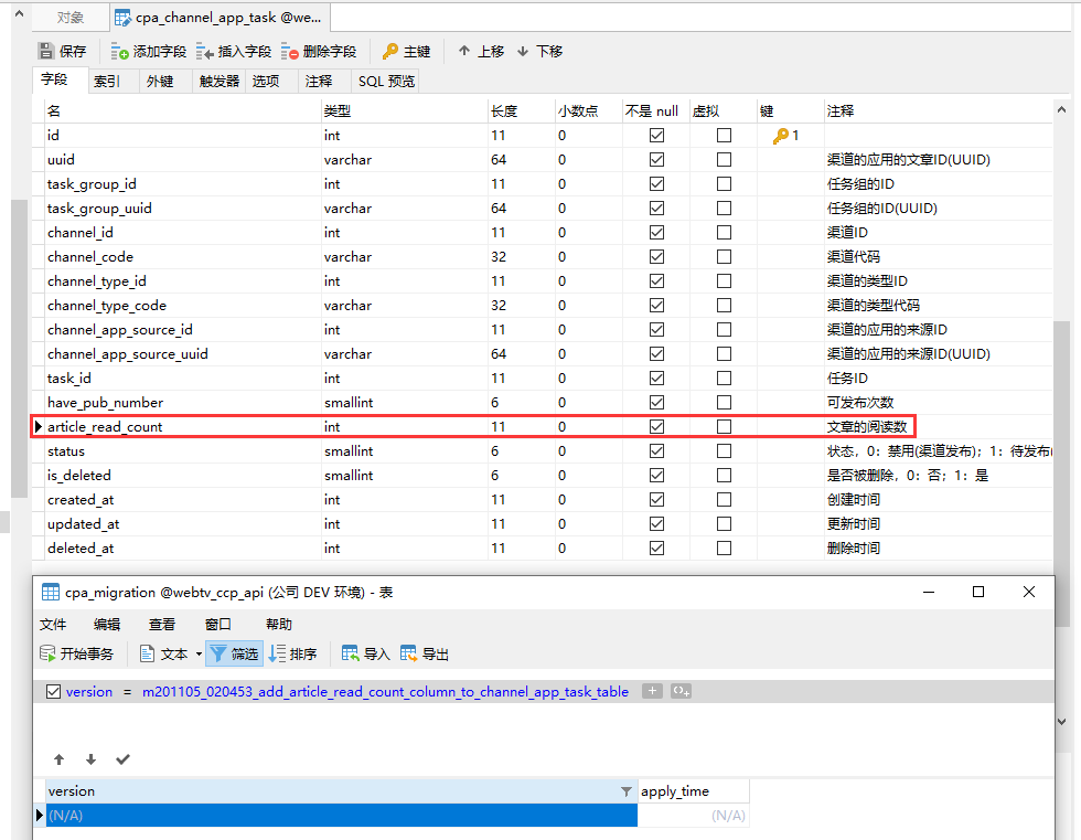 > add column article_read_count integer NOT NULL DEFAULT 0 COMMENT '文章的阅读数' AFTER `have_pub_number` to table {{%channel_app_task}} ...Exception: SQLSTATE[42S21]: Column already exists: 1060 Duplicate column name 'article_read_count'