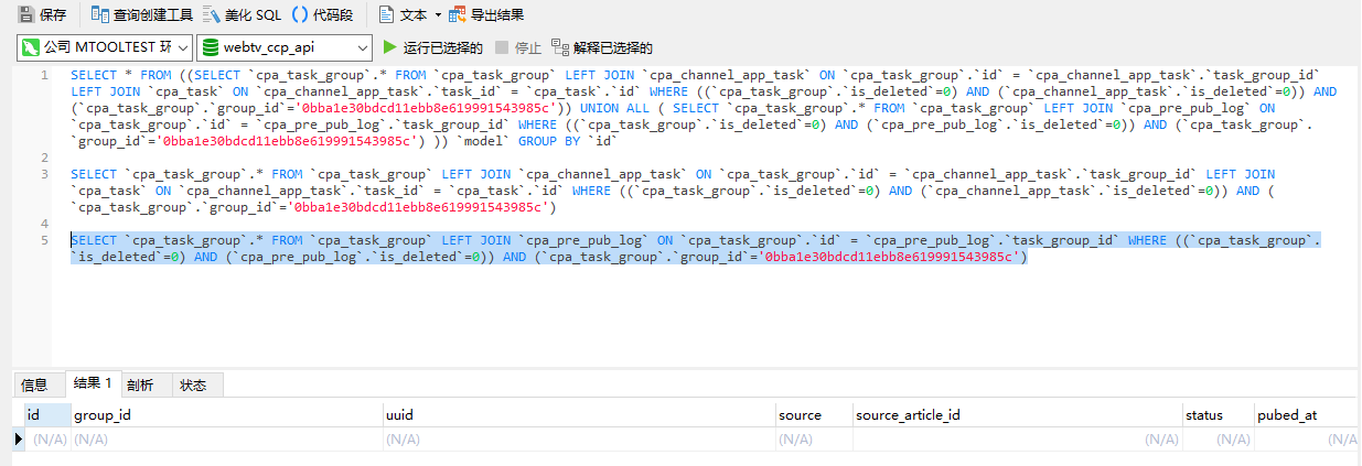 SELECT id,group_id FROM ((SELECT `cpa_task_group`.* FROM `cpa_task_group` LEFT JOIN `cpa_channel_app_task` ON `cpa_task_group`.`id` = `cpa_channel_app_task`.`task_group_id` LEFT JOIN `cpa_task` ON `cpa_channel_app_task`.`task_id` = `cpa_task`.`id` WHERE ((`cpa_task_group`.`is_deleted`=0) AND (`cpa_channel_app_task`.`is_deleted`=0)) AND (`cpa_task_group`.`group_id`='0bba1e30bdcd11ebb8e619991543985c')) UNION ALL ( SELECT `cpa_task_group`.* FROM `cpa_task_group` LEFT JOIN `cpa_pre_pub_log` ON `cpa_task_group`.`id` = `cpa_pre_pub_log`.`task_group_id` WHERE ((`cpa_task_group`.`is_deleted`=0) AND (`cpa_pre_pub_log`.`is_deleted`=0)) AND (`cpa_task_group`.`group_id`='0bba1e30bdcd11ebb8e619991543985c') )) `model` GROUP BY `id`,group_id