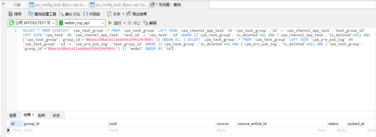 SELECT * FROM ((SELECT `cpa_task_group`.* FROM `cpa_task_group` LEFT JOIN `cpa_channel_app_task` ON `cpa_task_group`.`id` = `cpa_channel_app_task`.`task_group_id` LEFT JOIN `cpa_task` ON `cpa_channel_app_task`.`task_id` = `cpa_task`.`id` WHERE ((`cpa_task_group`.`is_deleted`=0) AND (`cpa_channel_app_task`.`is_deleted`=0)) AND (`cpa_task_group`.`group_id`='0bba1e30bdcd11ebb8e619991543985c')) UNION ALL ( SELECT `cpa_task_group`.* FROM `cpa_task_group` LEFT JOIN `cpa_pre_pub_log` ON `cpa_task_group`.`id` = `cpa_pre_pub_log`.`task_group_id` WHERE ((`cpa_task_group`.`is_deleted`=0) AND (`cpa_pre_pub_log`.`is_deleted`=0)) AND (`cpa_task_group`.`group_id`='0bba1e30bdcd11ebb8e619991543985c') )) `model` GROUP BY `id`