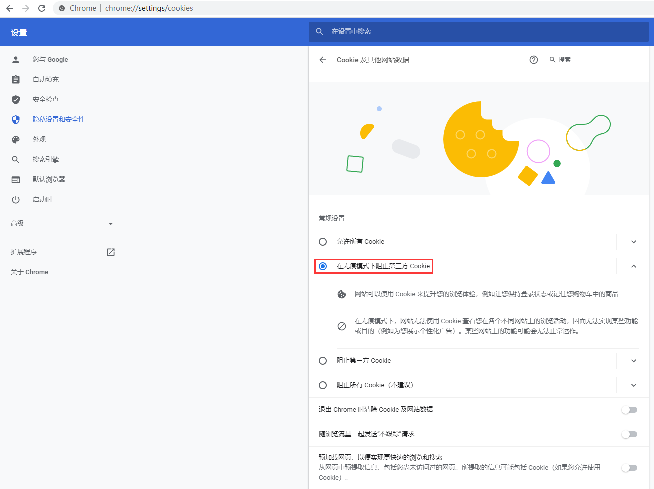 5、chrome://settings/content/cookies,把这句复制到浏览器回车。当前选择:在无痕模式下阻止第三方 Cookie。如图5