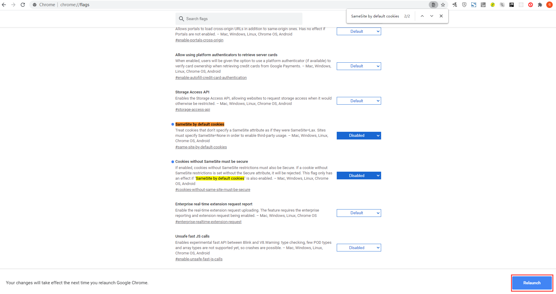 6、基于第三步,chrome://flags/,把这句复制到浏览器回车。SameSite by default cookies,其值:Default -> Disabled;Cookies without SameSite must be secure,其值:Default -> Disabled;Schemeful Same-Site,其值:Default -> Disabled。重启浏览器生效。如图6