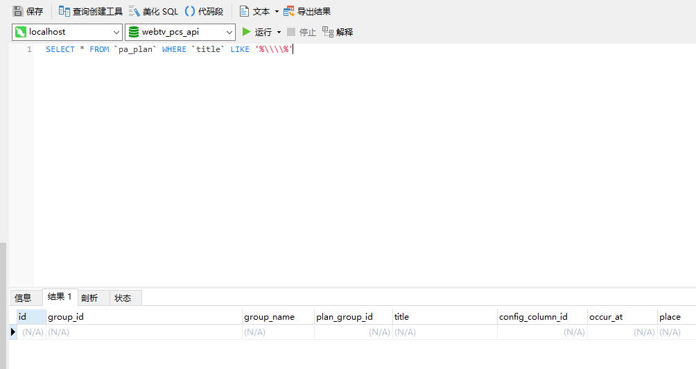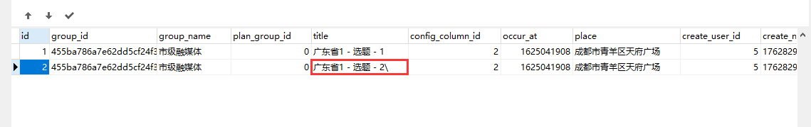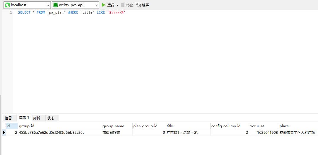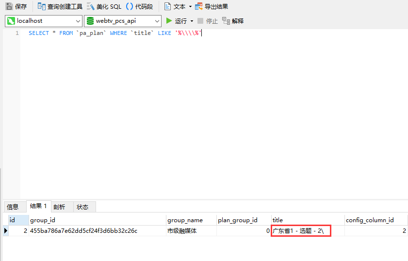 2、查看表 plan 中的字段 title 的值,其中一条记录存在 \。理论上能够查询出一条记录才是。如图2