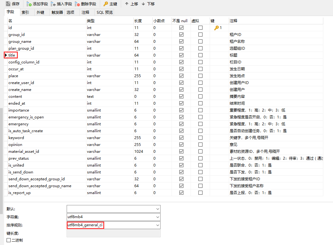 4、查看表 plan 中的字段 title 的排序规则,其值为:utf8mb4_unicode_ci。如图4