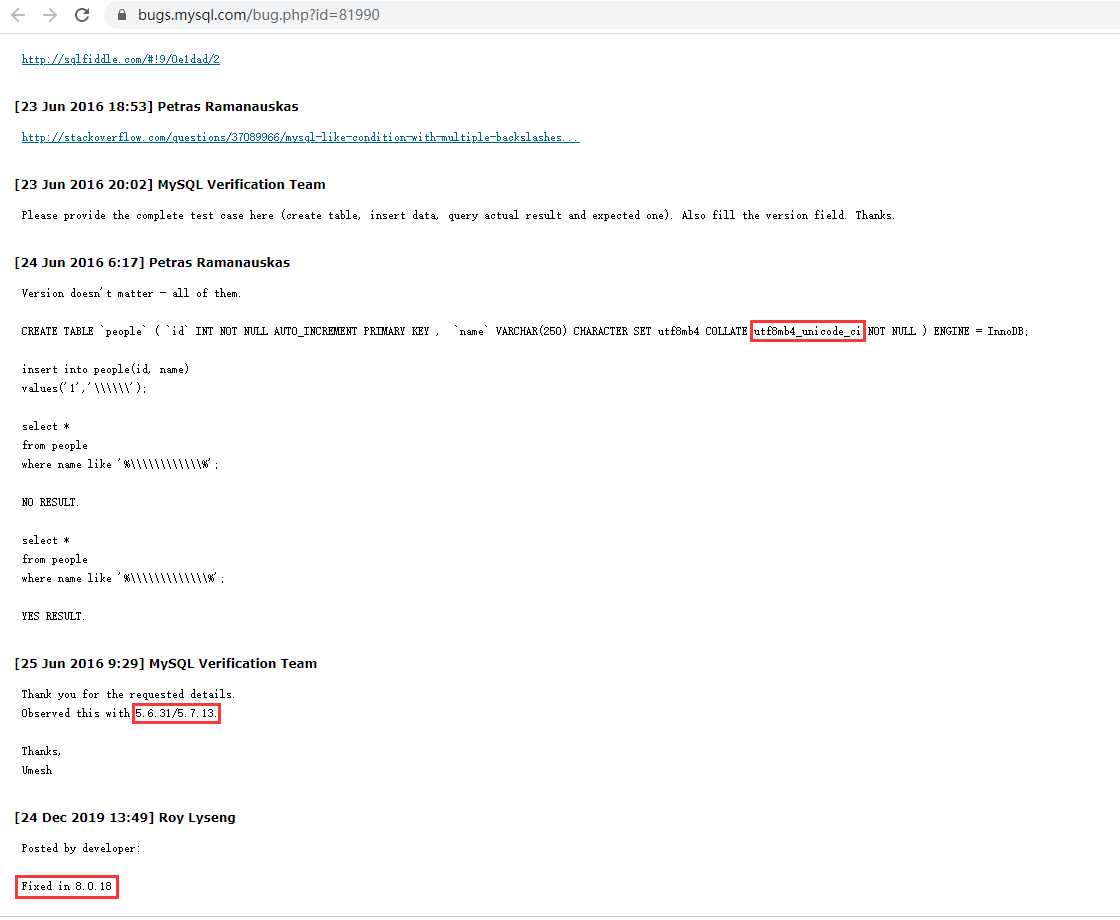 8、查看 MySQL 官方文档,参考:https://bugs.mysql.com/bug.php?id=81990 。在 MySQL 版本:5.6.31/5.7.13 中,排序规则,其值为:utf8mb4_unicode_ci 时,皆需要针对 \ 的搜索,再添加 1 根,才能够搜索出结果。此 Bug 在 MySQL 版本:8.0.18 得以修复。如图8