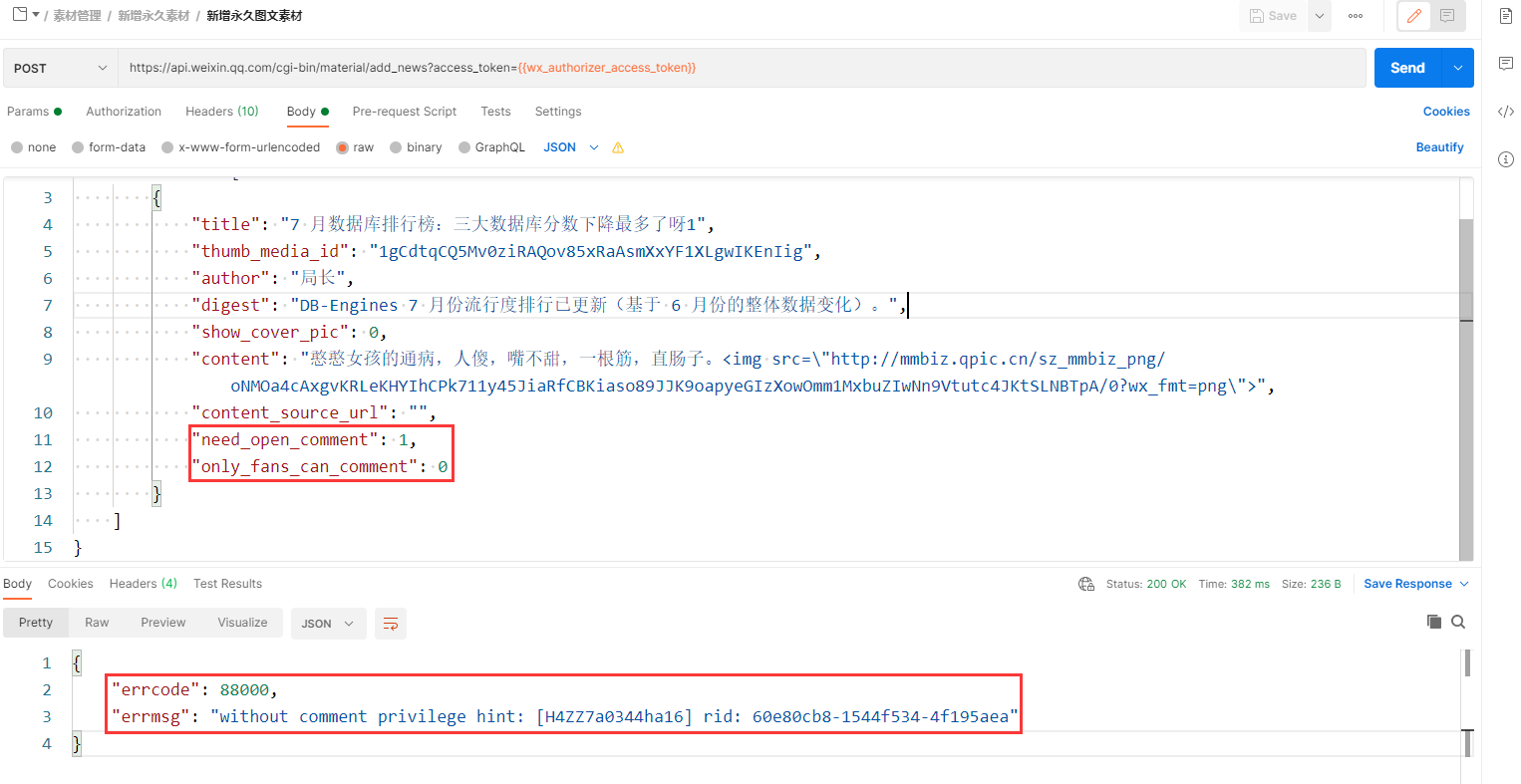 微信公众号新增永久图文素材时,报错:errcode,88000;errmsg:without comment privilege hint: [H4ZZ7a0344ha16] rid: 60e80cb8-1544f534-4f195aea