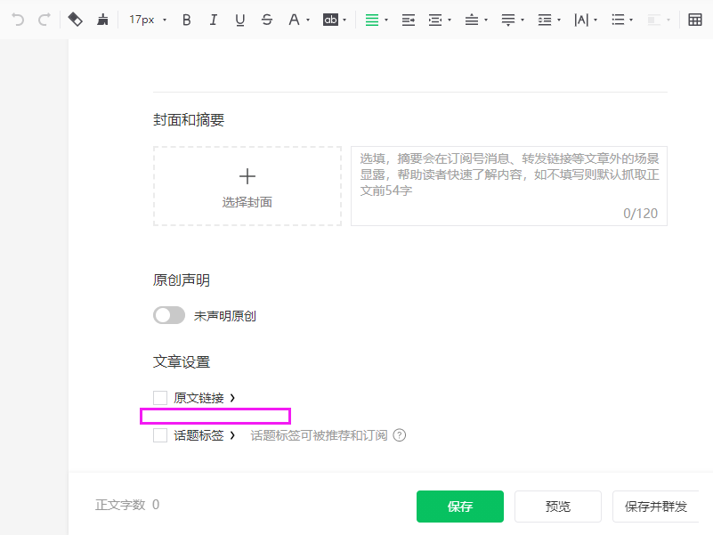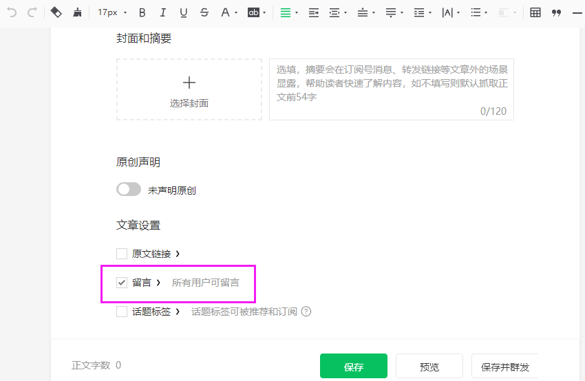 5、在报错的公众号后台新建图文消息时候,无留言功能的开关。如图5