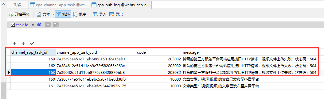 1、当上传视频失败后,偶现渠道的应用的任务的状态【4:审核中(平台)】,而不是【3:已失败(渠道发布)】。查看发布日志表,1 条抖音内容,同一时间发至 5 个抖音帐号。其中 3 个帐号上传视频失败。渠道的应用的任务ID:159、162、163。如图1