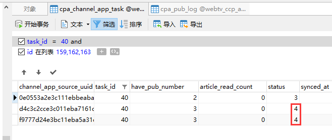 2、查看渠道的应用的任务表,渠道的应用的任务ID:159、162、163所对应的 3 条记录,预期状态【3:已失败(渠道发布)】。但是渠道的应用的任务ID:162、163所对应的 3 条记录,状态【4:审核中(平台)】。如图2