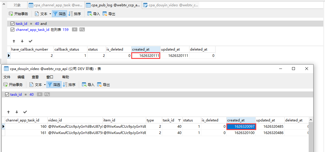 4、最后决定分析任务ID:40 下的其他渠道的应用的任务ID:160、161。当渠道的应用的任务ID:160上传视频成功后,执行创建视频的操作。在此操作中,竟然更新为 4 时,基于任务ID,而不是基于渠道的应用的任务ID。如图3