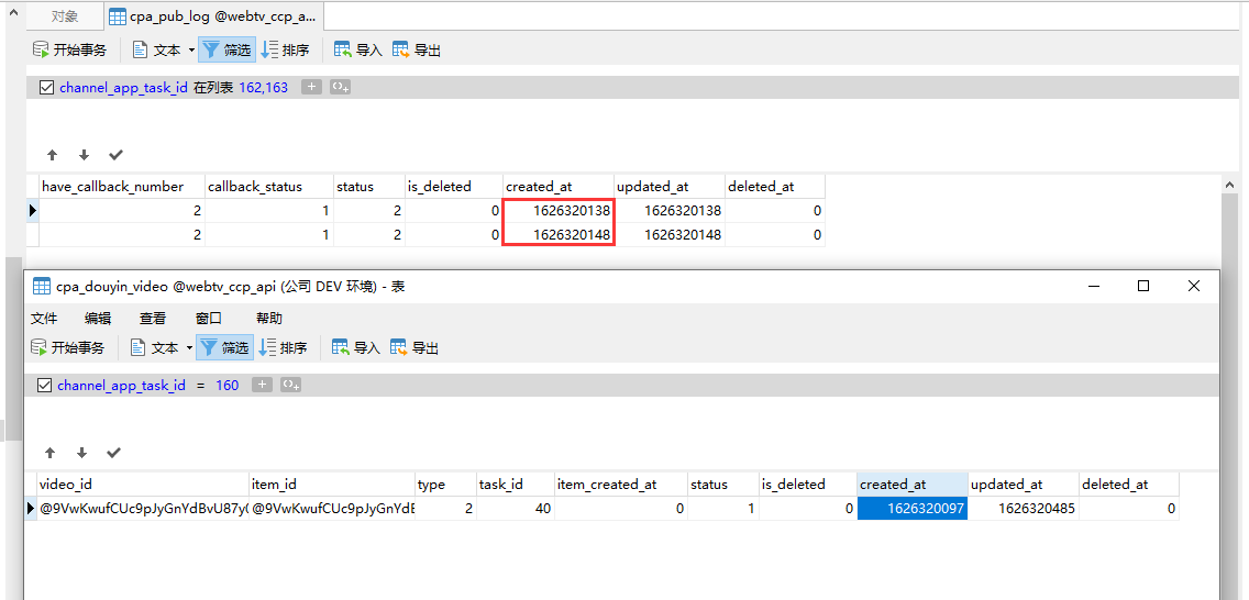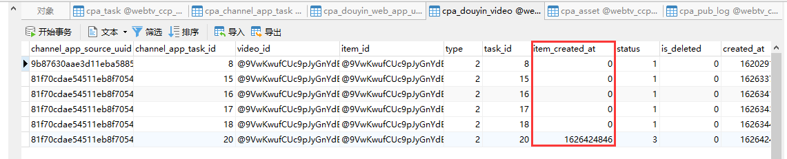 8、渠道的应用的任务ID:160上传视频成功的时间节点:2021-07-15 11:34:57。渠道的应用的任务ID:160创建视频成功的时间节点无记录,但是其肯定晚于 2021-07-15 11:34:57。后续计划添加字段:item_created_at 至表:cpa_douyin_video。注释:视频内容的创建时间。如图6