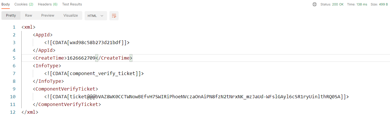 <xml> <AppId> <![CDATA[wxd98c58b273d21bdf]]> </AppId> <CreateTime>1626662709</CreateTime> <InfoType> <![CDATA[component_verify_ticket]]> </InfoType> <ComponentVerifyTicket> <![CDATA[ticket@@@bVAZ8WK0CCTWNowBEfvH7SWIRiPhoeNVczaOnAiPN8fzN2tNrxNK_mzJaUd-WFslGAyl6cSR1ryUinlthRQ0SA]]> </ComponentVerifyTicket> </xml>