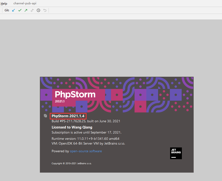 1、查看 PhpStorm 的当前版本,Help -> About。PhpStorm 2021.1.4。如图1