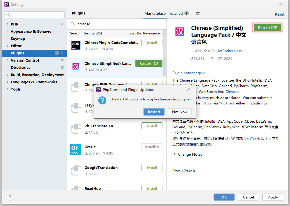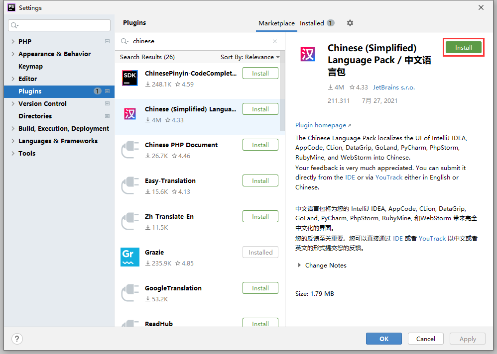 2、File -> Settings -> Plugins -> Marketplace。搜索:chinese。选择并 Install:Chinese (Simplified) Language Pack / 中文语言包 。中文语言包将为您的 IntelliJ IDEA, AppCode, CLion, DataGrip, GoLand, PyCharm, PhpStorm, RubyMine, 和WebStorm 带来完全中文化的界面。如图2