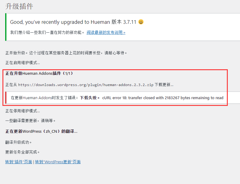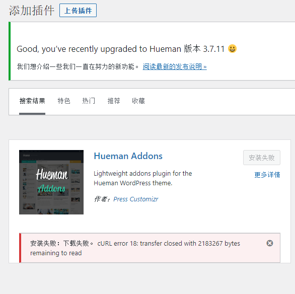 1、在更新Hueman Addons时发生了错误:下载失败。 cURL error 18: transfer closed with 2183267 bytes remaining to read。cURL 错误 18:传输已关闭,还有 2183267 个字节可供读取。如图1