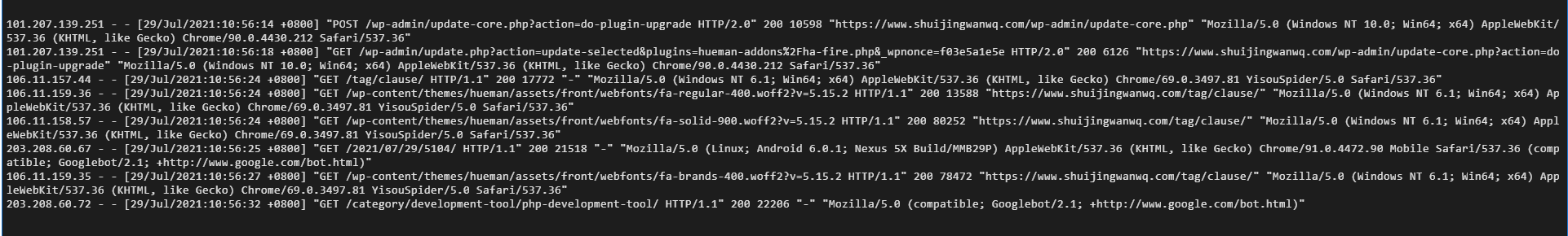 101.207.139.251 - - [29/Jul/2021:10:56:14 +0800] "POST /wp-admin/update-core.php?action=do-plugin-upgrade HTTP/2.0" 200 10598 "https://www.shuijingwanwq.com/wp-admin/update-core.php" "Mozilla/5.0 (Windows NT 10.0; Win64; x64) AppleWebKit/537.36 (KHTML, like Gecko) Chrome/90.0.4430.212 Safari/537.36" 101.207.139.251 - - [29/Jul/2021:10:56:18 +0800] "GET /wp-admin/update.php?action=update-selected&plugins=hueman-addons%2Fha-fire.php&_wpnonce=f03e5a1e5e HTTP/2.0" 200 6126 "https://www.shuijingwanwq.com/wp-admin/update-core.php?action=do-plugin-upgrade" "Mozilla/5.0 (Windows NT 10.0; Win64; x64) AppleWebKit/537.36 (KHTML, like Gecko) Chrome/90.0.4430.212 Safari/537.36" 106.11.157.44 - - [29/Jul/2021:10:56:24 +0800] "GET /tag/clause/ HTTP/1.1" 200 17772 "-" "Mozilla/5.0 (Windows NT 6.1; Win64; x64) AppleWebKit/537.36 (KHTML, like Gecko) Chrome/69.0.3497.81 YisouSpider/5.0 Safari/537.36" 106.11.159.36 - - [29/Jul/2021:10:56:24 +0800] "GET /wp-content/themes/hueman/assets/front/webfonts/fa-regular-400.woff2?v=5.15.2 HTTP/1.1" 200 13588 "https://www.shuijingwanwq.com/tag/clause/" "Mozilla/5.0 (Windows NT 6.1; Win64; x64) AppleWebKit/537.36 (KHTML, like Gecko) Chrome/69.0.3497.81 YisouSpider/5.0 Safari/537.36" 106.11.158.57 - - [29/Jul/2021:10:56:24 +0800] "GET /wp-content/themes/hueman/assets/front/webfonts/fa-solid-900.woff2?v=5.15.2 HTTP/1.1" 200 80252 "https://www.shuijingwanwq.com/tag/clause/" "Mozilla/5.0 (Windows NT 6.1; Win64; x64) AppleWebKit/537.36 (KHTML, like Gecko) Chrome/69.0.3497.81 YisouSpider/5.0 Safari/537.36" 203.208.60.67 - - [29/Jul/2021:10:56:25 +0800] "GET /2021/07/29/5104/ HTTP/1.1" 200 21518 "-" "Mozilla/5.0 (Linux; Android 6.0.1; Nexus 5X Build/MMB29P) AppleWebKit/537.36 (KHTML, like Gecko) Chrome/91.0.4472.90 Mobile Safari/537.36 (compatible; Googlebot/2.1; +http://www.google.com/bot.html)" 106.11.159.35 - - [29/Jul/2021:10:56:27 +0800] "GET /wp-content/themes/hueman/assets/front/webfonts/fa-brands-400.woff2?v=5.15.2 HTTP/1.1" 200 78472 "https://www.shuijingwanwq.com/tag/clause/" "Mozilla/5.0 (Windows NT 6.1; Win64; x64) AppleWebKit/537.36 (KHTML, like Gecko) Chrome/69.0.3497.81 YisouSpider/5.0 Safari/537.36" 203.208.60.72 - - [29/Jul/2021:10:56:32 +0800] "GET /category/development-tool/php-development-tool/ HTTP/1.1" 200 22206 "-" "Mozilla/5.0 (compatible; Googlebot/2.1; +http://www.google.com/bot.html)"