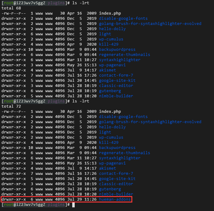 6、查看插件目录:/data/wwwroot/www.shuijingwanwq.com/wp-content/plugins,其中存在目录:hueman-addons。如图5