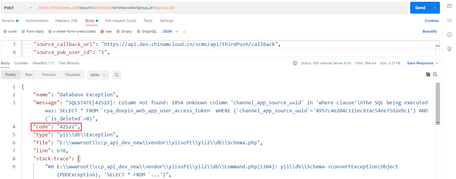"message": "SQLSTATE[42S22]: Column not found: 1054 Unknown column 'channel_app_source_uuid' in 'where clause'\nThe SQL being executed was: SELECT * FROM `cpa_douyin_web_app_user_access_token` WHERE (`channel_app_source_uuid`='8957c4e204c111ec97ac54ee75d2ebc1') AND (`is_deleted`=0)",