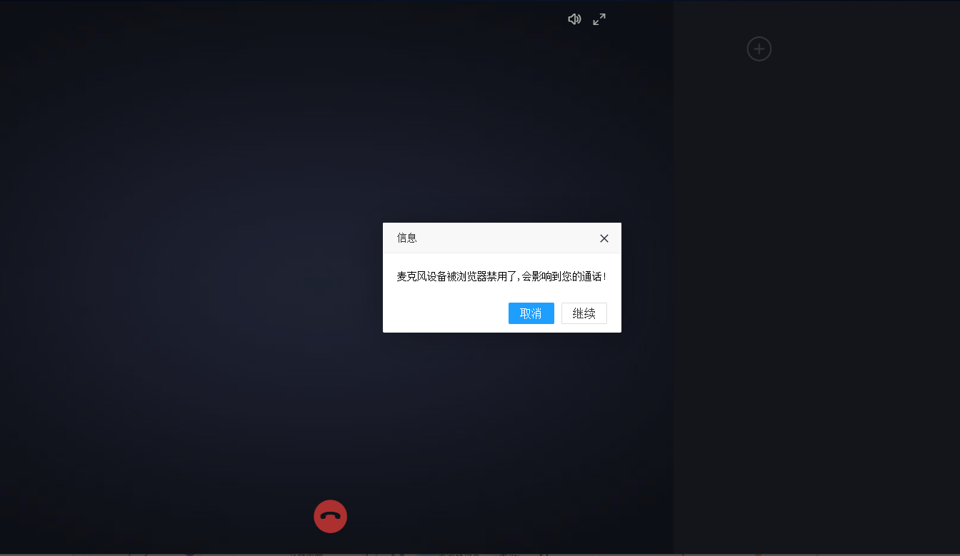 1、麦克风设备被浏览器禁用了,会影响到您的通话!。如图1