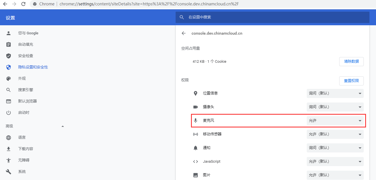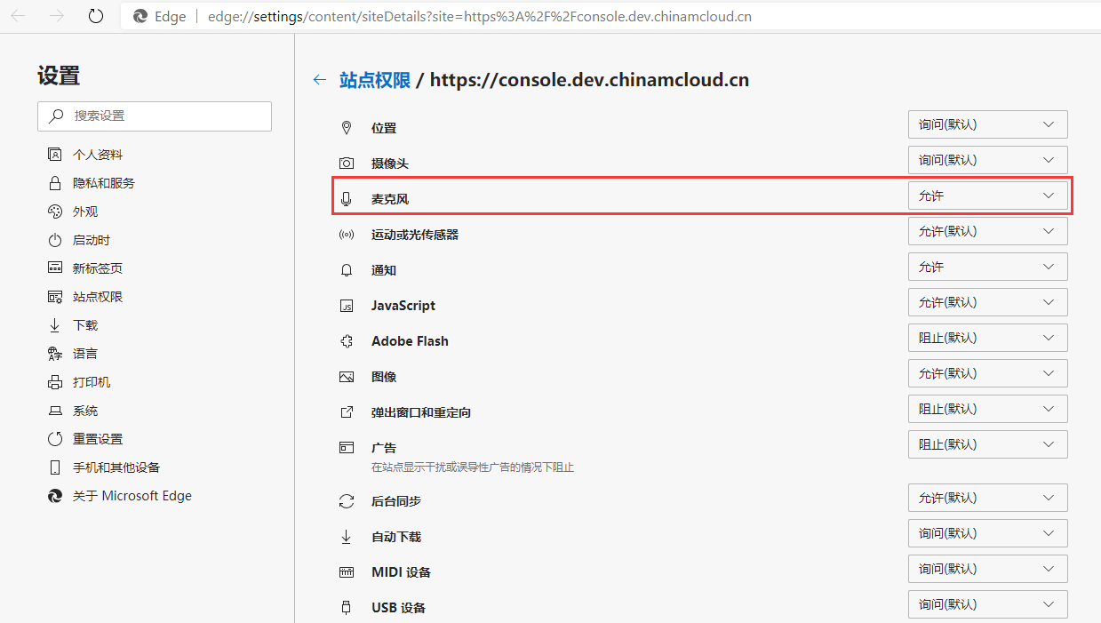 5、在所有网站 – console.dev.chinamcloud.cn – 权限 – 麦克风 – 允许。如图5