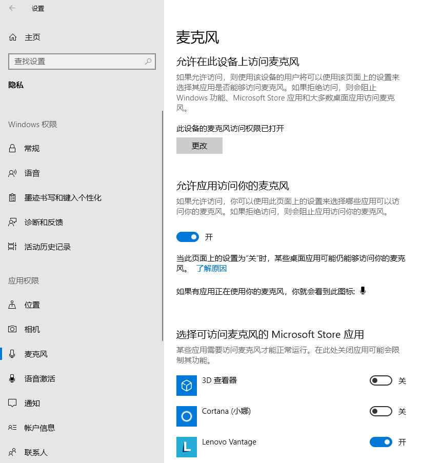 3、怀疑是因为电脑本身未开启麦克风的权限。Windows 设置 – 隐私 – 应用权限 – 麦克风。此设备的麦克风访问权限已打开。如图3