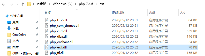 3、本地环境为 Windows 10,查看扩展目录:C:\php-7.4.6\ext,文件 php_exif.dll 存在。如图3
