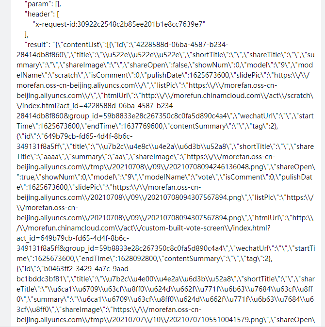 "result": "{\"contentList\":[{\"id\":\"4228588d-06ba-4587-b234-28414db8f860\",\"title\":\"\\u522e\\u522e\\u522e\",\"shortTitle\":\"\",\"shareTitle\":\"\",\"summary\":\"\",\"shareImage\":\"\",\"shareOpen\":false,\"showNum\":0,\"model\":\"9\",\"modelName\":\"scratch\",\"isComment\":0,\"pulishDate\":1625673600,\"slidePic\":\"https:\\/\\/morefan.oss-cn-beijing.aliyuncs.com\\/\",\"listPic\":\"https:\\/\\/morefan.oss-cn-beijing.aliyuncs.com\\/\",\"htmlUrl\":\"http:\\/\\/morefun.chinamcloud.com\\/act\\/scratch\\/index.html?act_id=4228588d-06ba-4587-b234-28414db8f860&group_id=59b8833e28c267350c8c0fa5d890c4a4\",\"wechatUrl\":\"\",\"startTime\":1625673600,\"endTime\":1637769600,\"contentSummary\":\"\",\"tag\":2},{\"id\":\"649b79cb-fd65-4d4f-8b6c-349131f8a5ff\",\"title\":\"\\u7b2c\\u4e8c\\u4e2a\\u6d3b\\u52a8\",\"shortTitle\":\"\",\"shareTitle\":\"aaaa\",\"summary\":\"aa\",\"shareImage\":\"https:\\/\\/morefan.oss-cn-beijing.aliyuncs.com\\/tmp\\/20210708\\/09\\/20210708094246136048.png\",\"shareOpen\":true,\"showNum\":0,\"model\":\"9\",\"modelName\":\"vote\",\"isComment\":0,\"pulishDate\":1625673600,\"slidePic\":\"https:\\/\\/morefan.oss-cn-beijing.aliyuncs.com\\/20210708\\/09\\/20210708094307567894.png\",\"listPic\":\"https:\\/\\/morefan.oss-cn-beijing.aliyuncs.com\\/20210708\\/09\\/20210708094307567894.png\",\"htmlUrl\":\"http:\\/\\/morefun.chinamcloud.com\\/act\\/custom-built-vote-screen\\/index.html?act_id=649b79cb-fd65-4d4f-8b6c-349131f8a5ff&group_id=59b8833e28c267350c8c0fa5d890c4a4\",\"wechatUrl\":\"\",\"startTime\":1625673600,\"endTime\":1628092800,\"contentSummary\":\"\",\"tag\":2},{\"id\":\"b0463ff2-3429-4a7c-9aad-bc1bddc3bf81\",\"title\":\"\\u7b2c\\u4e00\\u4e2a\\u6d3b\\u52a8\",\"shortTitle\":\"\",\"shareTitle\":\"\\u6ca1\\u6709\\u63cf\\u8ff0\\u624d\\u662f\\u771f\\u6b63\\u7684\\u63cf\\u8ff0\",\"summary\":\"\\u6ca1\\u6709\\u63cf\\u8ff0\\u624d\\u662f\\u771f\\u6b63\\u7684\\u63cf\\u8ff0\",\"shareImage\":\"https:\\/\\/morefan.oss-cn-beijing.aliyuncs.com\\/tmp\\/20210707\\/10\\/20210707105510041579.png\",\"shareOpen\":true,\"showNum\":0,\"model\":\"9\",\"modelName\":\"vote\",\"isComment\":0,\"pulishDate\":1625587200,\"slidePic\":\"https:\\/\\/morefan.oss-cn-beijing.aliyuncs.com\\/20210707\\/10\\/20210707105550856930.jpg\",\"listPic\":\"https:\\/\\/morefan.oss-cn-beijing.aliyuncs.com\\/20210707\\/10\\/20210707105550856930.jpg\",\"htmlUrl\":\"http:\\/\\/morefun.chinamcloud.com\\/act\\/vote-screen\\/index.html?act_id=b0463ff2-3429-4a7c-9aad-bc1bddc3bf81&group_id=59b8833e28c267350c8c0fa5d890c4a4\",\"wechatUrl\":\"\",\"startTime\":1625587200,\"endTime\":1632499200,\"contentSummary\":\"\",\"tag\":2}],\"returnCode\":100,\"number\":10,\"currentPage\":1,\"totalPage\":0,\"total\":0,\"com_id\":1,\"serverTime\":1631780097,\"returnDesc\":\"\\u6210\\u529f\"}"