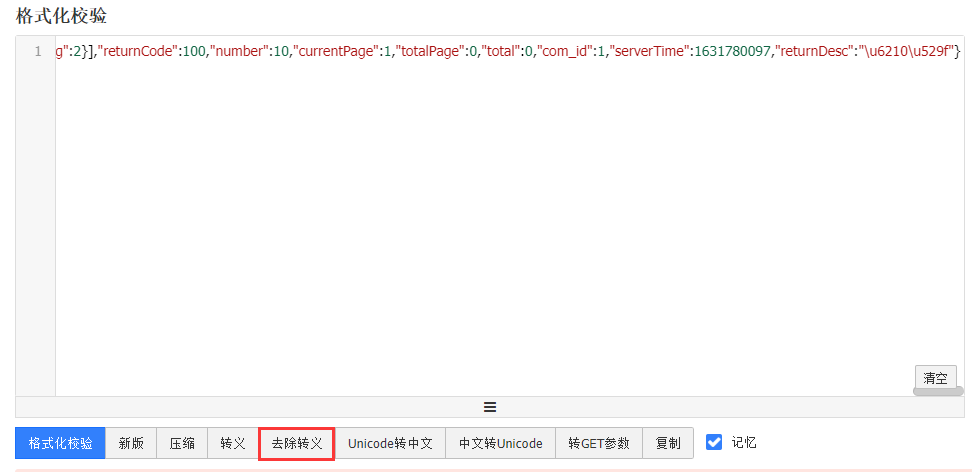 2、想将 result 字段的值进行 JSON 格式化。打开网址:https://www.bejson.com/ 。复制内容至在线工具中,然后点击 去除转义。如图2