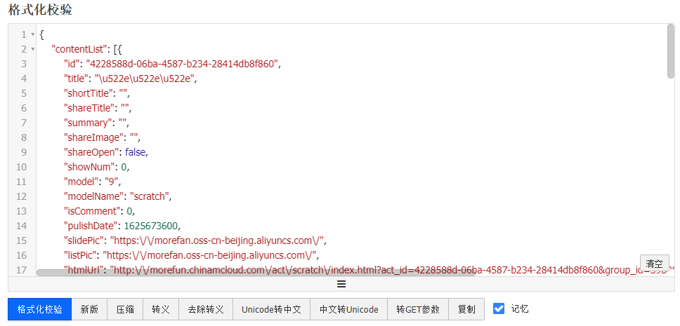 3、去除转义后,点击 格式化校验,得到查看友好的 JSON 内容。如图3