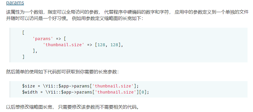 2、参考网址:https://www.yiiframework.com/doc/guide/2.0/zh-cn/structure-applications#params 。Yii::$app->params。如图2