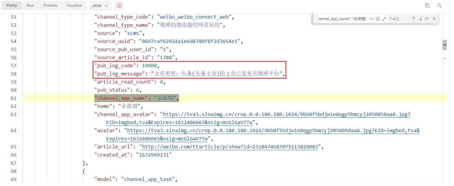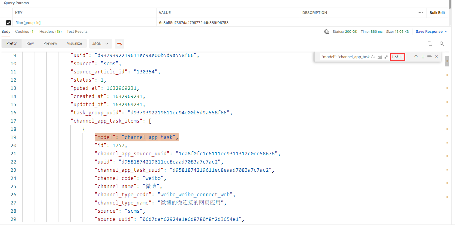 2、决定获取渠道发布接口响应,响应如下,/v1/task-groups?filter[group_id]=6c8b55e7387da4799772ddb389f06753&filter=scms&filter[source_article_id][in][0]=130354&group_id=6c8b55e7387da4799772ddb389f06753 。存在 11 条记录,页面上仅显示出 6 条记录。如图2