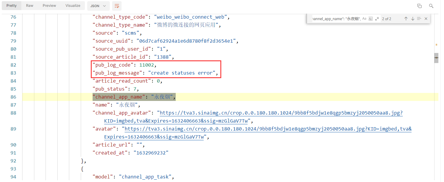 11、最终打印出请求数据,在一键多渠道发布中,一篇文章,选择了 6 个微博帐号,第 1 个帐号会发布1次。其他 5 个帐号会发布 2 次。总计 11 条记录。进而导致的 Bug:后面的 5 个帐号,第 1 次成功,第 2 次失败:代码:11002,信息:create statuses error。