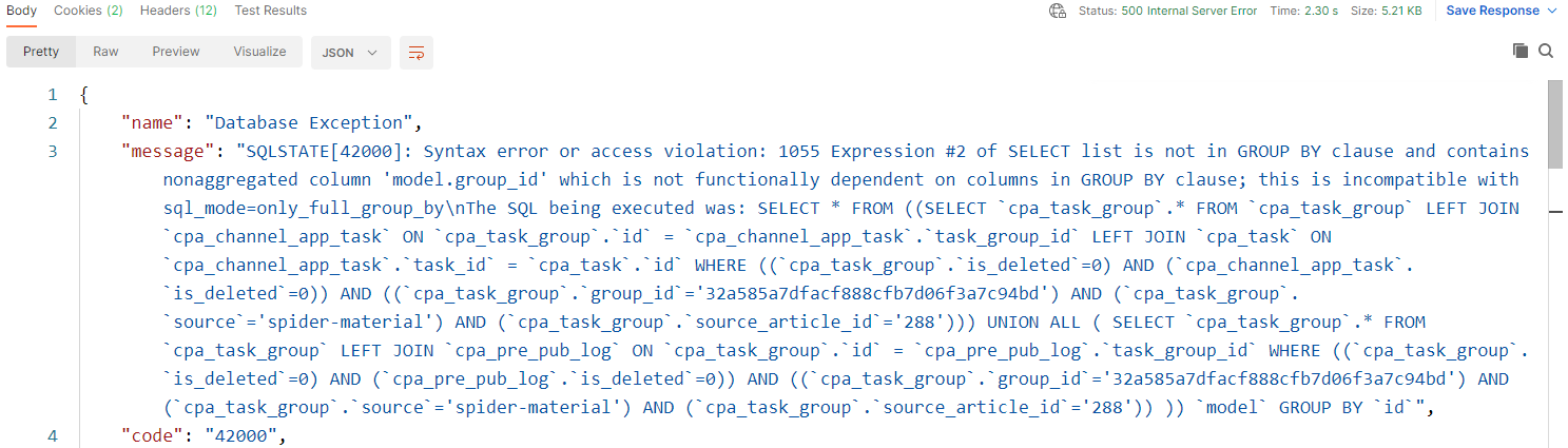 1、查询 SQL 报错:SQLSTATE[42000]: Syntax error or access violation: 1055 Expression #2 of SELECT list is not in GROUP BY clause and contains nonaggregated column ‘model.group_id’ which is not functionally dependent on columns in GROUP BY clause; this is incompatible with sql_mode=only_full_group_by。如图1