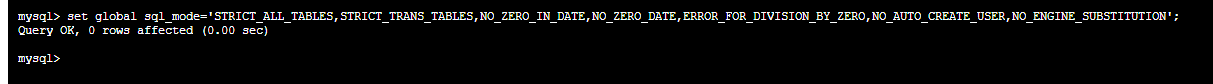 mysql> set global sql_mode='STRICT_ALL_TABLES,STRICT_TRANS_TABLES,NO_ZERO_IN_DATE,NO_ZERO_DATE,ERROR_FOR_DIVISION_BY_ZERO,NO_AUTO_CREATE_USER,NO_ENGINE_SUBSTITUTION'; Query OK, 0 rows affected (0.00 sec) mysql>