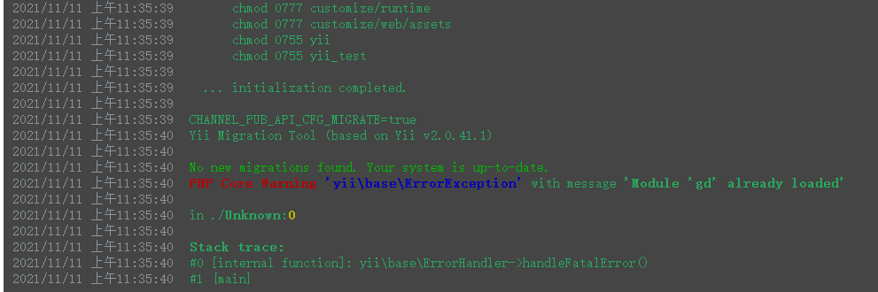 8、升级后,再次运行相关命令。报错:PHP Core Warning ‘yii\base\ErrorException’ with message ‘Module ‘exif’ already loaded’。如法炮制。在 Dockerfile 中新增:sed -i ‘/exif.so/d’ /usr/local/php/etc/php.ini && \ 。