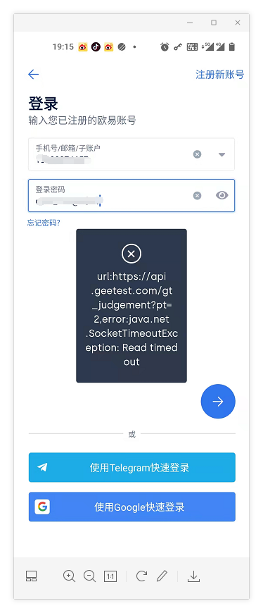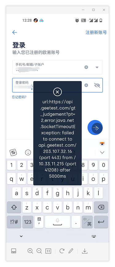 欧易(okex) APP 登录时报错:url:https://api.geetest.com/gt_judgement?pt=2,error:java.net.SocketTimeoutException:Read timed out