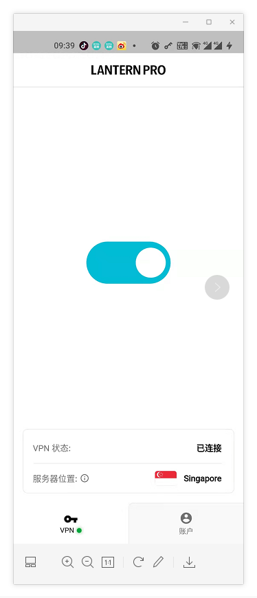 2、打开蓝灯,连接 VPN,服务器位置位于新加坡。如图2