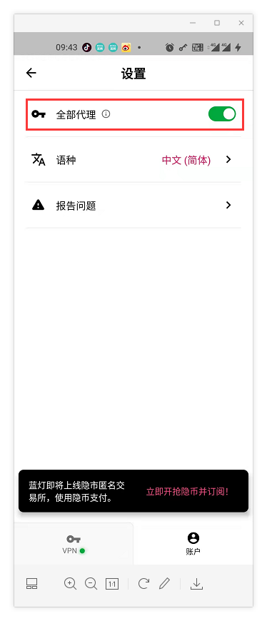 4、打开蓝灯,账户 – 设置 – 开启全部代理。如图4