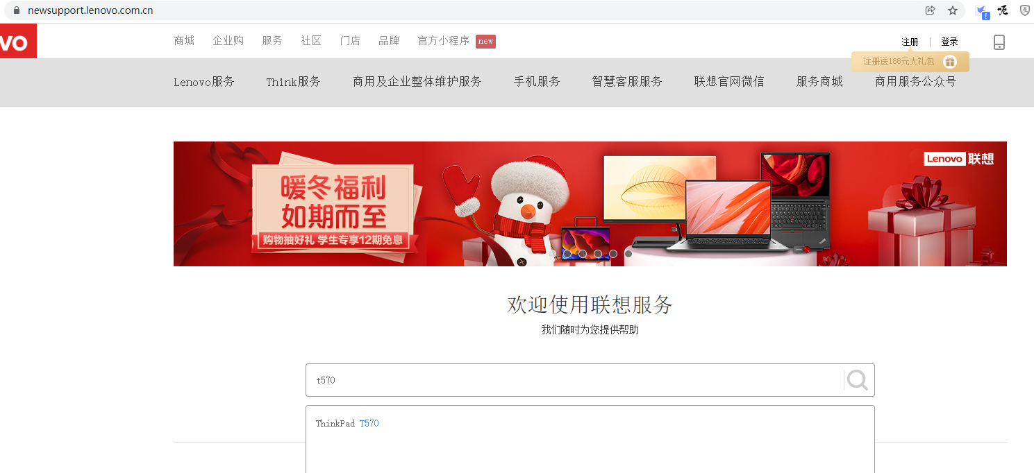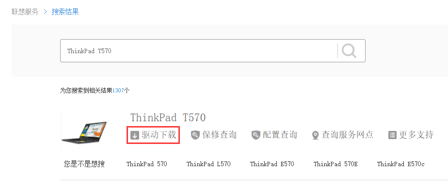 2、打开联想服务网址:https://newsupport.lenovo.com.cn/ 。搜索:t570,选择:ThinkPad T570。如图1
