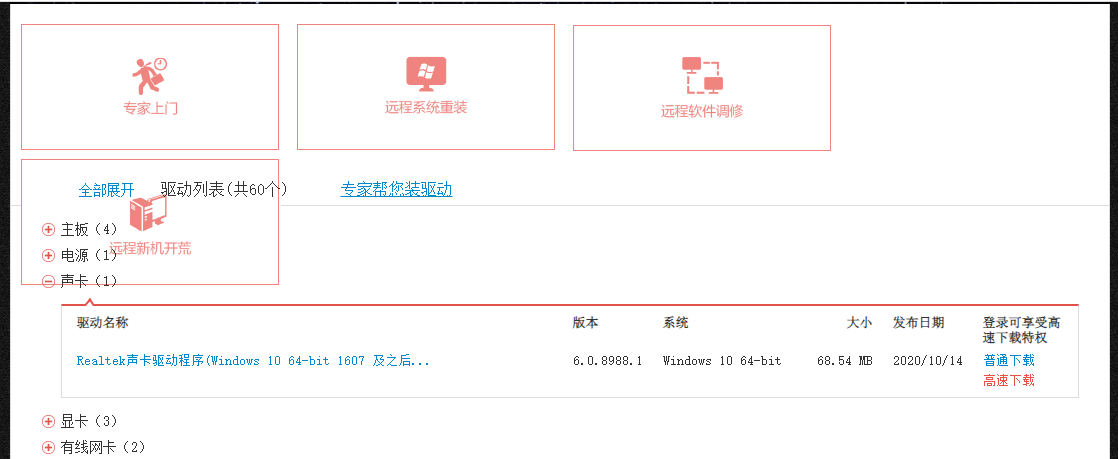 4、展开 声卡 ,显示:Realtek声卡驱动程序(Windows 10 64-bit 1607 及之后版本),下载并安装。文件名:Audio-n1va114w.exe。如图3